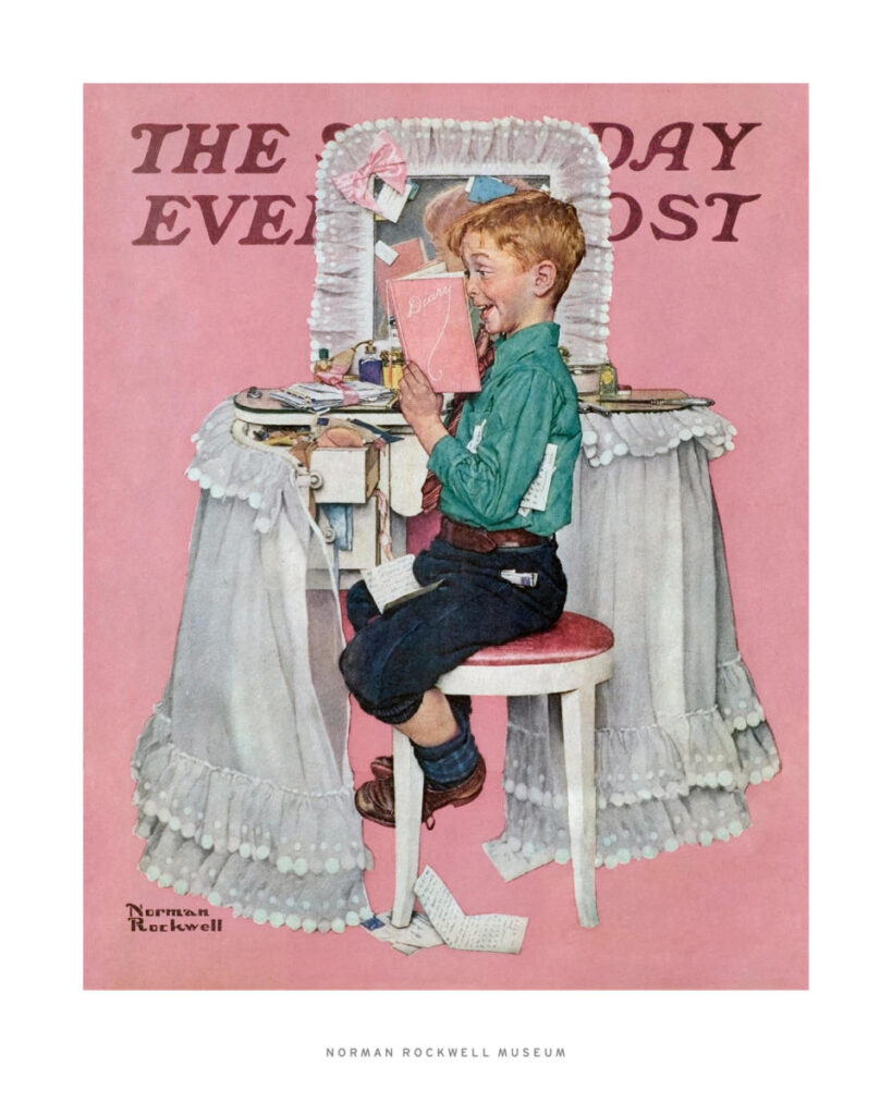In Secrets (Boy Reading Sister’s Diary), the trespass is quieter, perhaps softened by youth. A boy sits at his sister’s vanity table, reading her diary and laughing. The surface is messy—cosmetics scattered, drawers left open. Did he create this disorder to reach the diary, or did he simply take advantage of it? Or is the mess itself a sign of something else: a girl who does not yet fully know who she is, still sorting through thoughts and selves, leaving her private world temporarily undone?