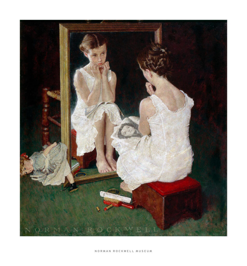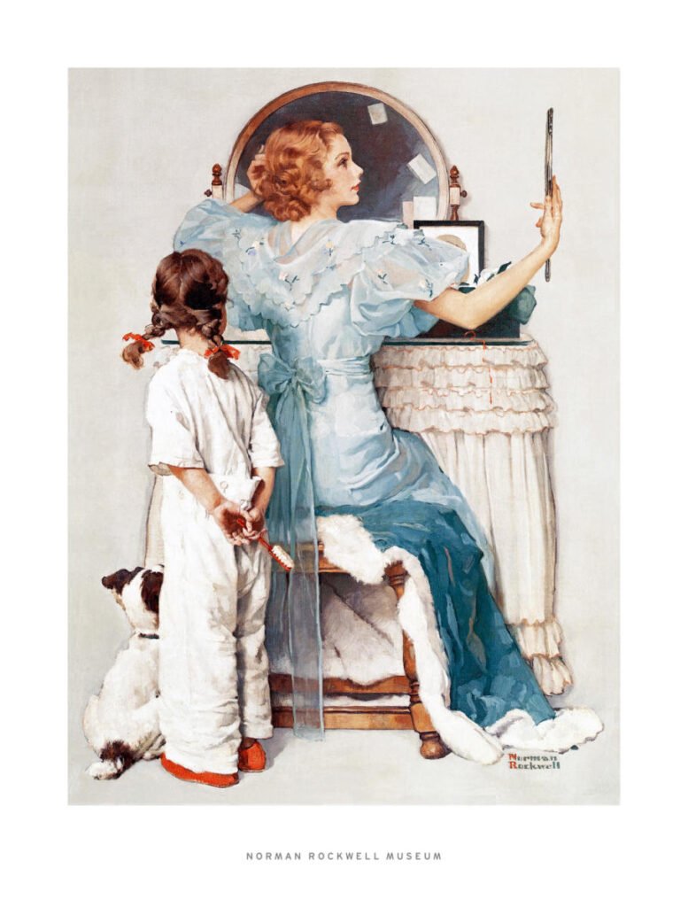 Behind her, the little sister watches. But what is she watching exactly—the technique, the transformation, or the possibility that she too will one day sit here? Even the dog is present, positioned differently, angled at yet another height. No one acknowledges the others. Rockwell arranges a quiet hierarchy of attention: self-assessment, aspiration, and loyal observation. Beauty now has witnesses, but it remains essentially solitary.